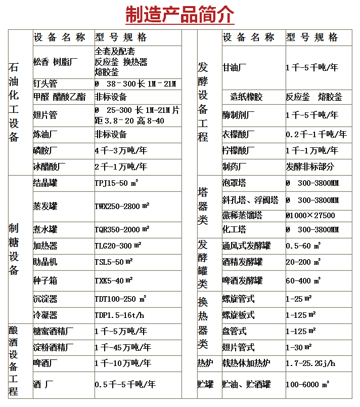 設(shè)備制造:承接糖廠、釀酒廠、酒精廠、啤酒廠、松香樹脂廠、石油化工、制藥、環(huán)保、輕工等廠家所需單臺(tái)配套設(shè)備或全套流程生產(chǎn)線工程設(shè)備!本公司提供現(xiàn)場(chǎng)施工及工廠制造、技術(shù)開發(fā)業(yè)務(wù)。所生產(chǎn)的設(shè)備指標(biāo)符合國(guó)家執(zhí)行的《國(guó)家標(biāo)準(zhǔn)》《行業(yè)標(biāo)準(zhǔn)》中規(guī)定的《鋼制壓力容器》《鋼制焊接常壓容器》《鋼制化工容器制造技術(shù)要求》《酒精蒸餾塔》《塔盤技術(shù)條件》《鋼制板式換熱器》《鋼制管殼式換熱器》《立式圓筒形鋼制焊接儲(chǔ)罐施工及驗(yàn)收規(guī)范》等技術(shù)國(guó)標(biāo)標(biāo)準(zhǔn)。